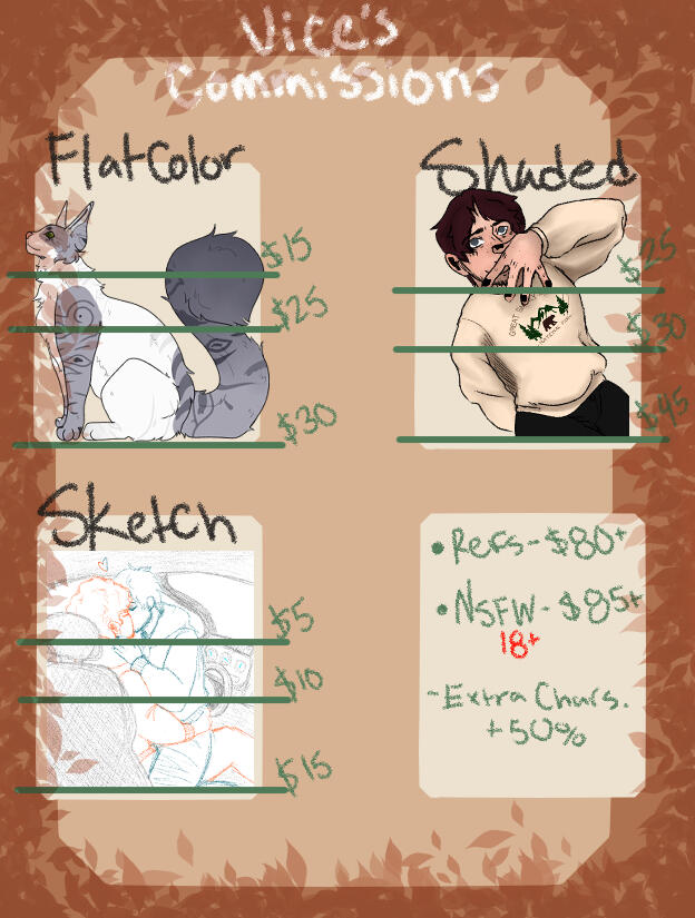 If changes are to be made when the piece is finished, there will be an additional charge.I have the right to cancel a commission at any time, for any reason. (Only this would include a refund)I retain copyright to my artwork, not your charactersPlease make sure to respond in regards to your WIP sketches!